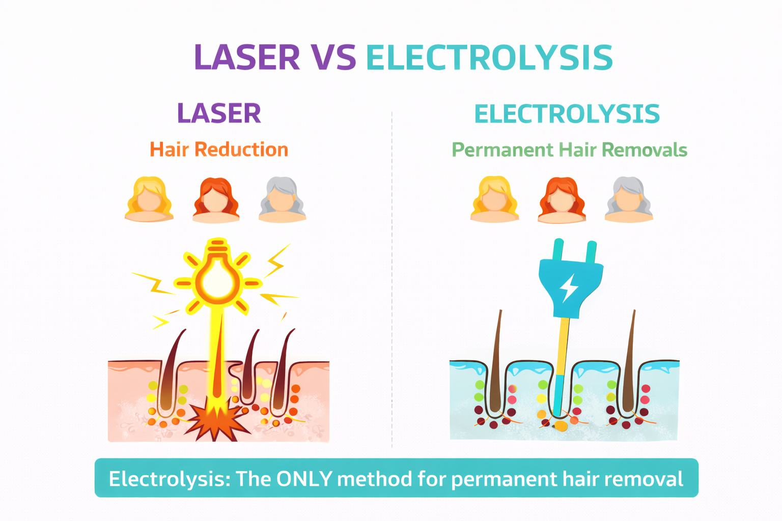 - Suitable for all hair types: Electrolysis can be applied to all hair types and skin colors, as it does not rely on pigment.